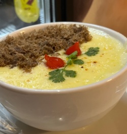 Creme de mandioca, carne de sol e mussarela