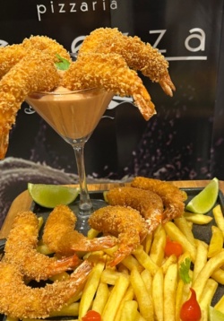 CAMARÕES SELECIONADOS E ENPANADOS COM BATATA FRITA E MOLHO ROSÉ.